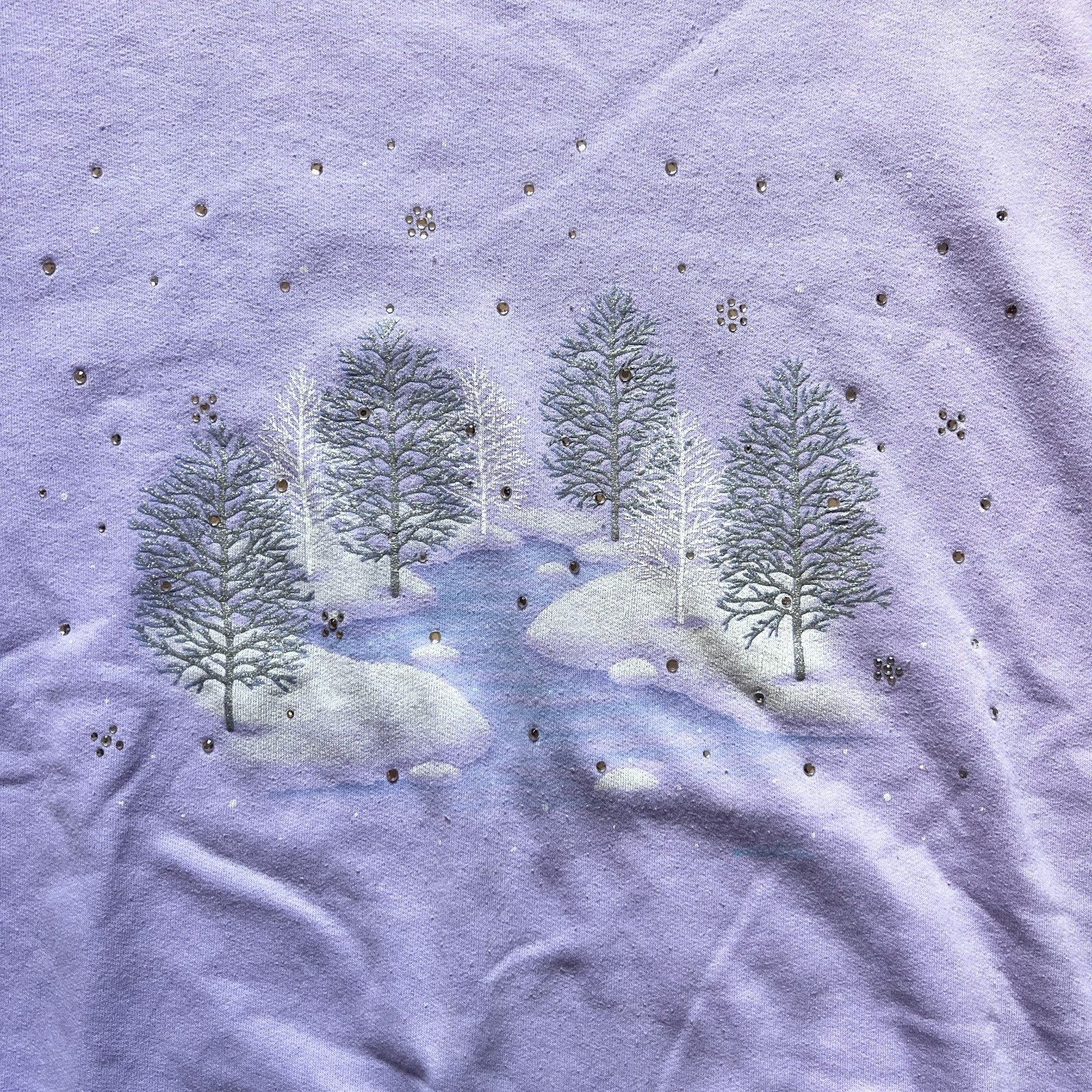 Vintage 90s Morning Sun Womens Sweatshirt Lilac Purple Rhinestones Faux Double Collar Winter Scenery