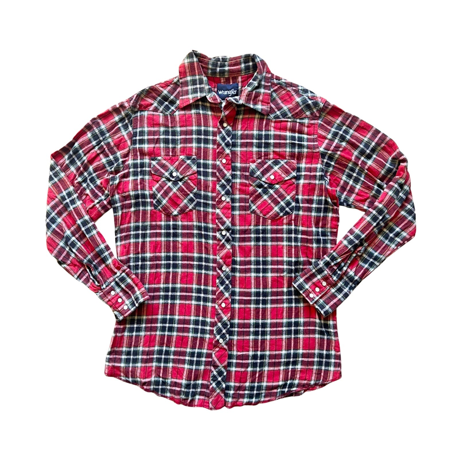 Vintage 90s Wrangler Mens Flannel Shirt Size L Red Plaid Pearl Snap Buttons