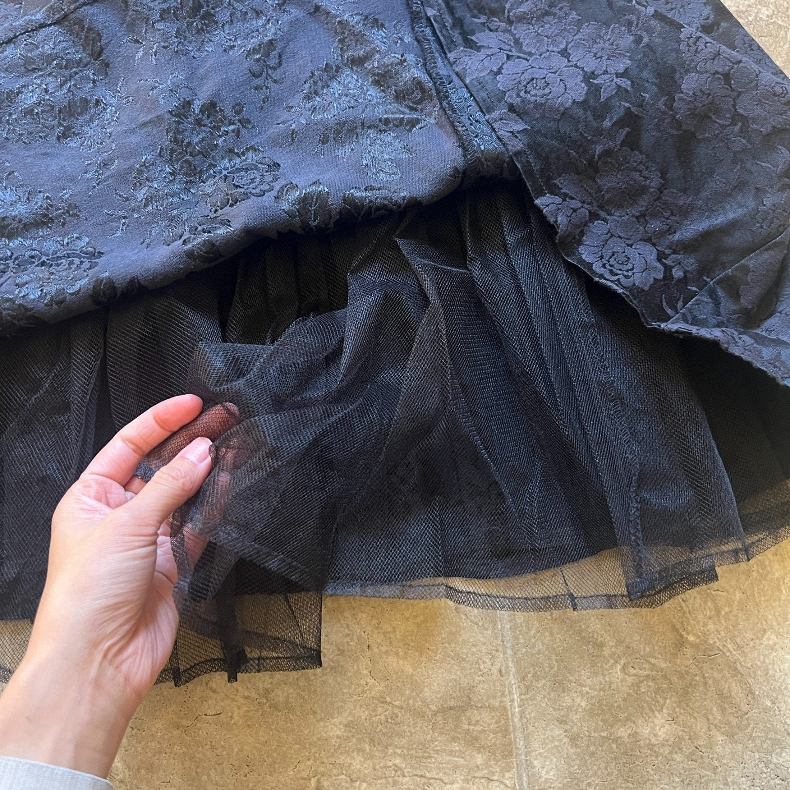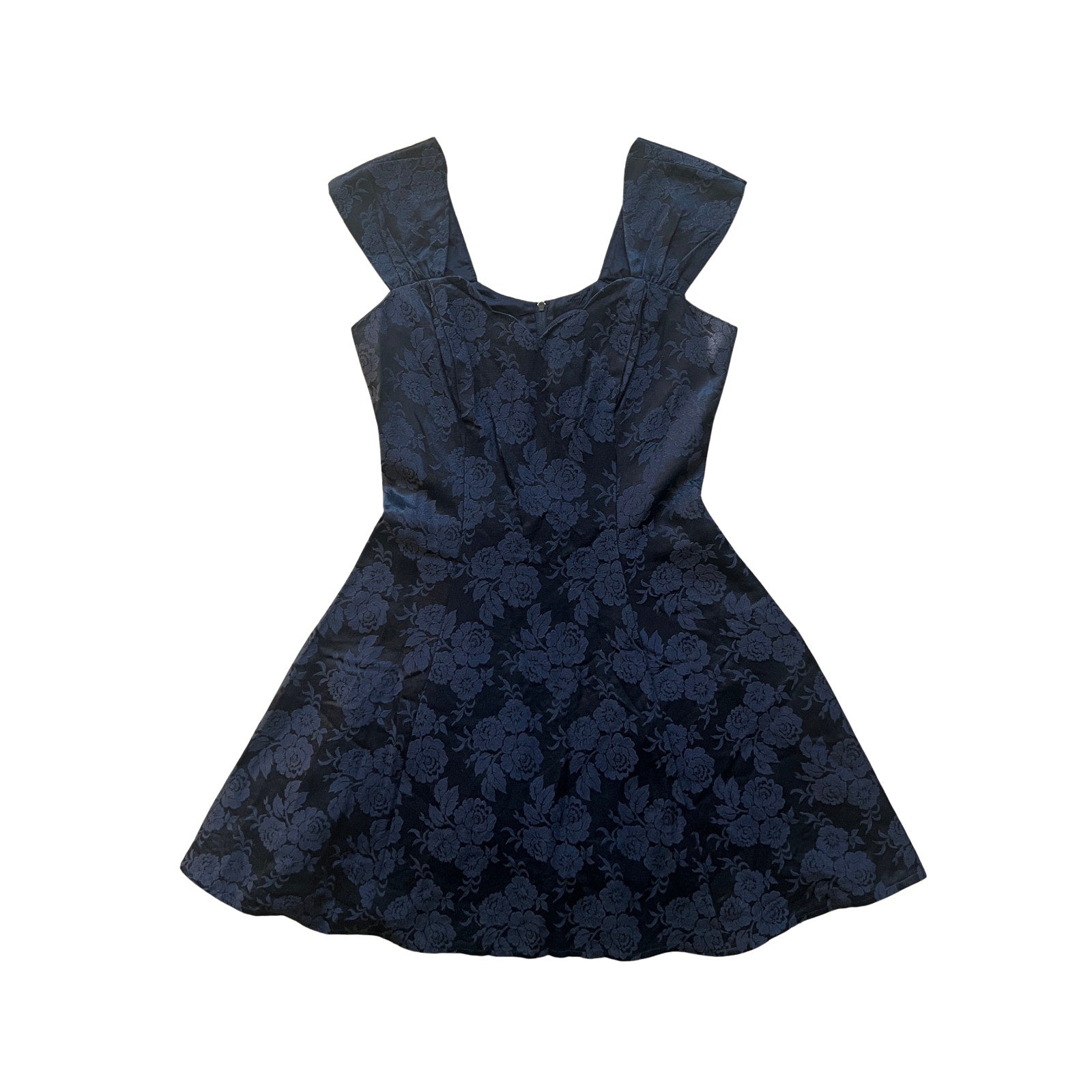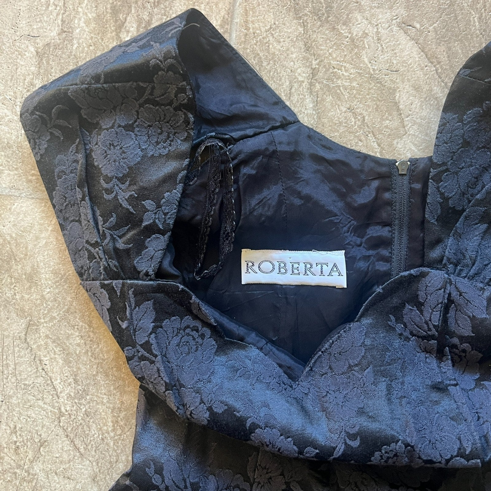 Vintage Roberta Womens Black Floral Jacquard Dress Fit & Flare Scalloped Neckline Tulle Lining Goth Romantic Feminine Whimsigoth Rockabilly