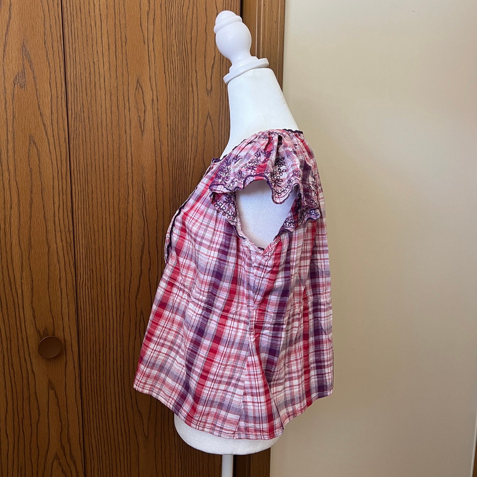 Vintage Y2K Fashion Bug Womens Plaid Top Size 1X Red Purple Embroidered Feminine Whimsical Preppy Twee Ktisch Romantic